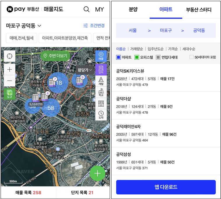 - 네이버 부동산 : 매물과 현재 가격, 실거래가 이력, 공시지가, 학군 등 상세한 정보들을 확인할 수 있습니다.