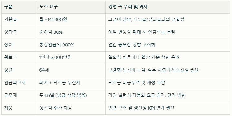 특히 ‘순이익 30% 성과급’과 ‘정년 연장’ 요구는 산업 및 인력 구조 변화의 불확실성이 큰 시점에서 조합원들의 미래 불안을 해소하려는 노조의 전략으로 읽힙니다. 근무단축 요구 또한 생산성 향상과 근로환경 개선의 균형을 모색하는 시도로 평가받고 있는데, 노사가 어느 정도의 조율점을 찾을 수 있을지가 관건입니다.