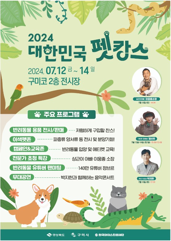 반려동물 인구 1,500만 시대입니다. 경상북도와 구미시 후원으로 진행되는 해당 축제는 동물정책사업 홍보와 다양한 반려동물 콘텐츠 개발을 위한 자리로 반려견, 반려묘와 파충류, 양서류 등 다양한 반려동물을 위한 공간이 마련됩니다.