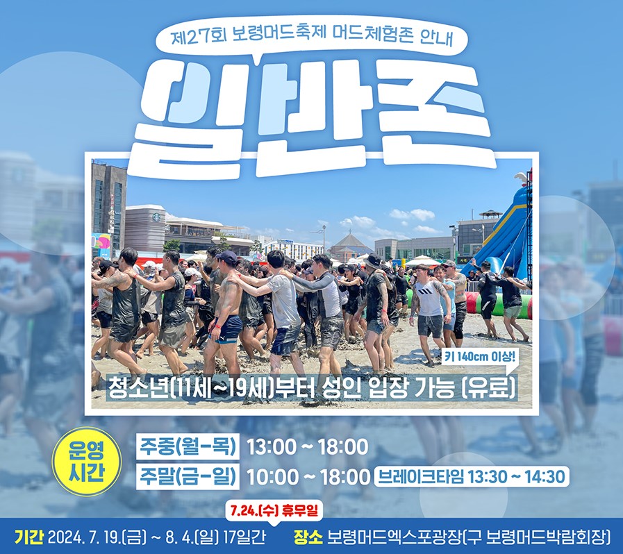 2024년 제27회 보령머드축제는 지구촌 최대의 여름축제로 국적, 언어, 연령의 구분없이 모두가 하나가 되어 즐기는 체험형 축제입니다. 대천해수욕장에서 열리며, 보령의 청정한 해양 머드를 활용해 다양한 체험과 놀이를 즐길 수 있습니다. 머드챌린지 대회, 머드풀, 머드 슬라이드, 머드레이스, 머드 마사지 등 다양한 머드체험프로그램도 마련되어 있어 가족, 친구, 연인과 함께 즐거운 시간을 보낼 수 있습니다. 또한 음악 공연과 불꽃놀이도 열리며, 외국인들에게도 인기가 많은 축제입니다.