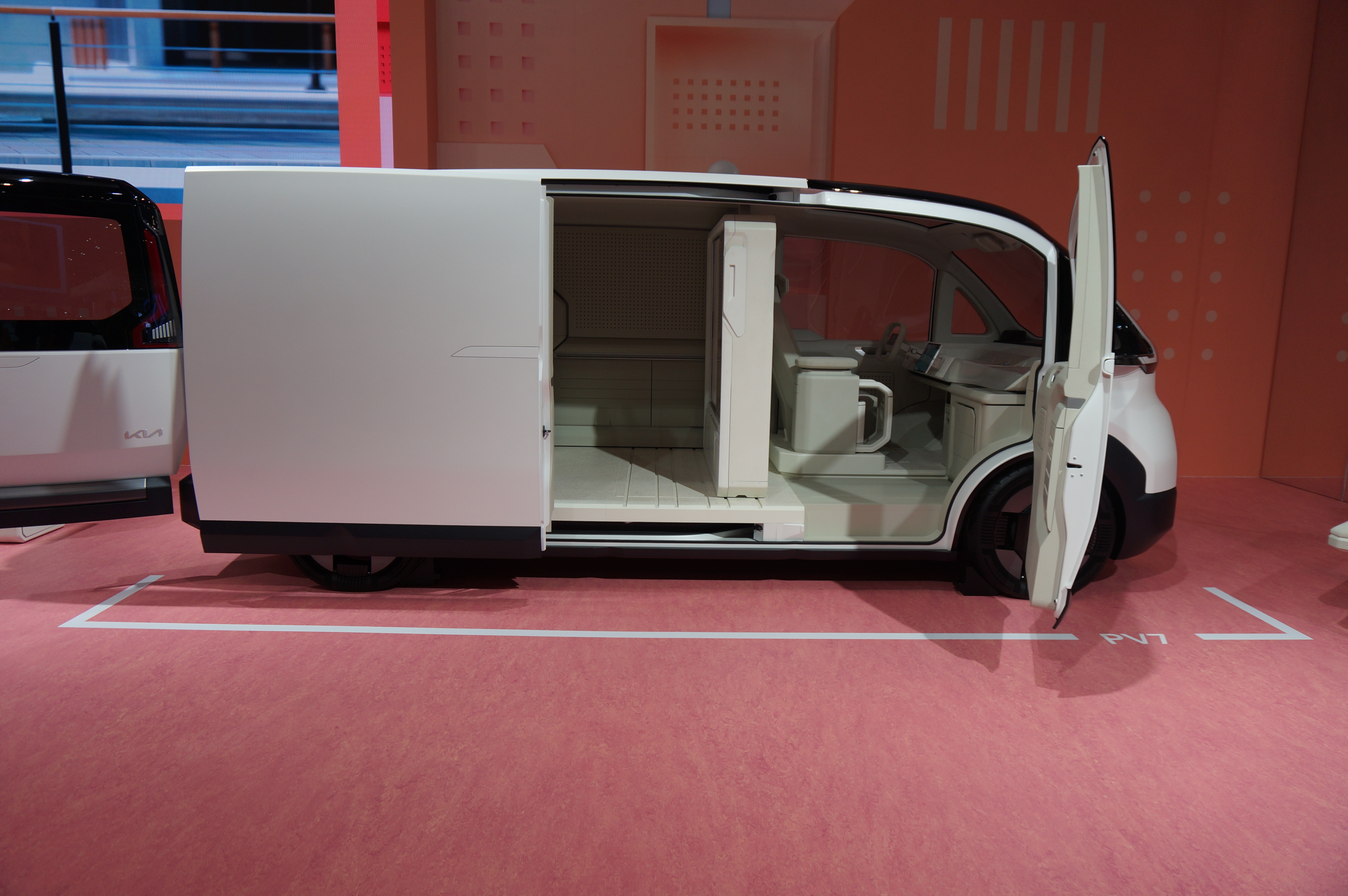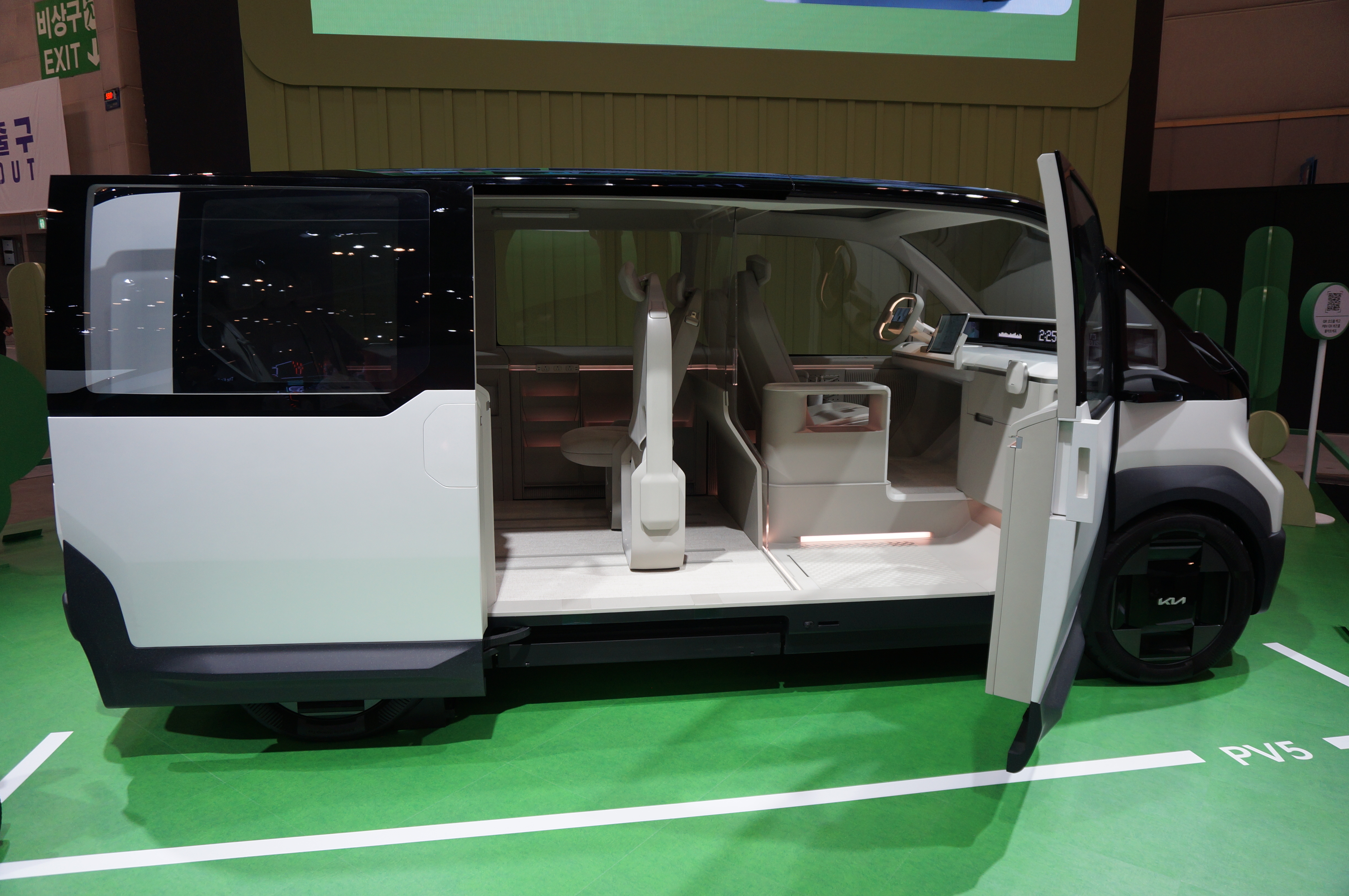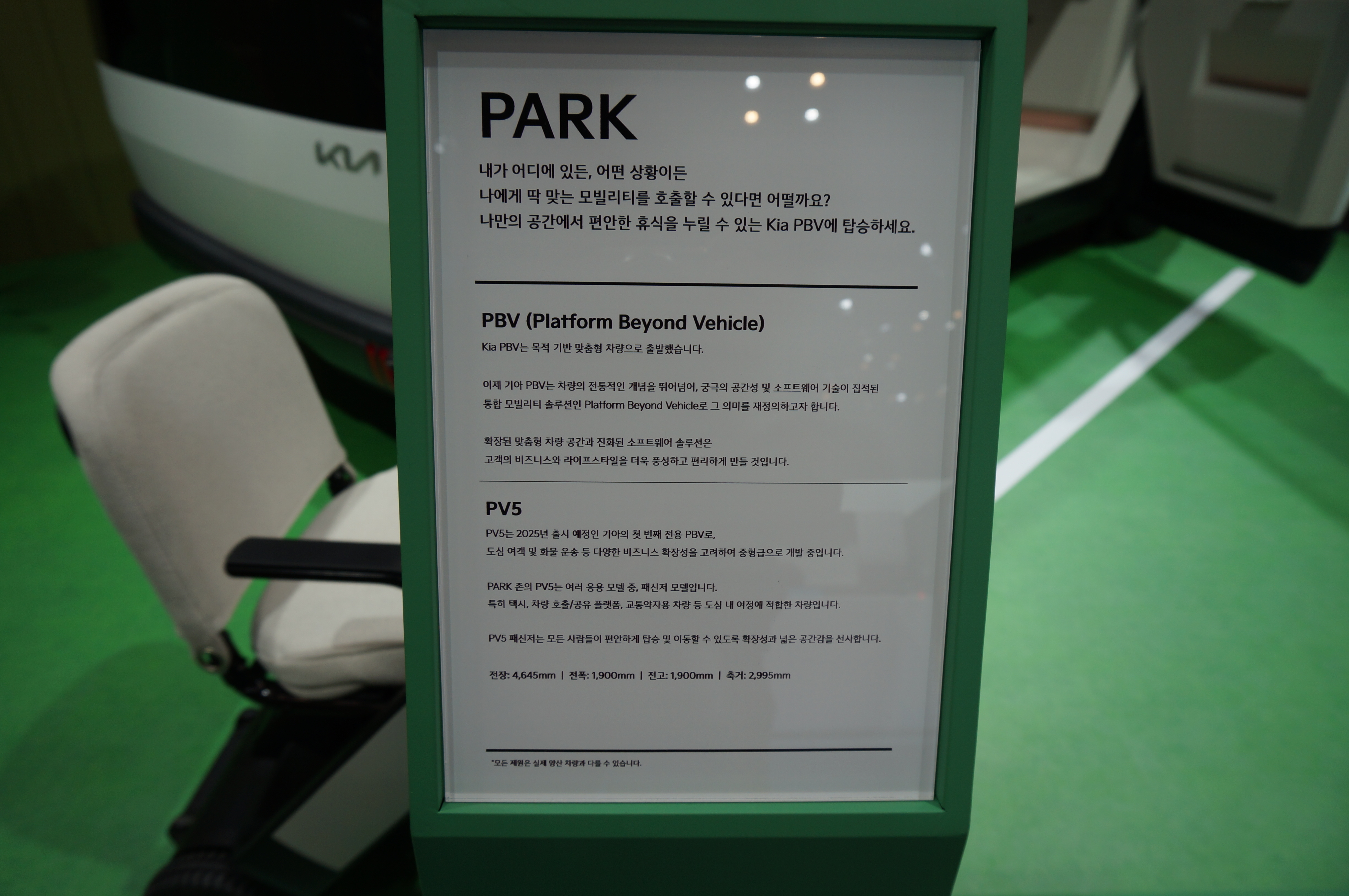 - PBV(Platform Beyond Vehicle) 2024년 초 CES에서 선보였던 PBV 중 하나인 PV5 콘셉트를 부산모빌리티쇼에서 다시 한번 선보였습니다. 25년 출시 예정이고 기아의 첫 번째 목적기반 맞춤형 전용 PBV로 도심 여객 및 화물 운송 등 다양한 비즈니스 확장성을 고려하여 중형급 차량으로 개발 중입니다.
