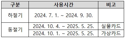 가상카드는 7월 1일부터 9월 말까지(하절기), 10월 1일부터 익년 5월 25일까지(동절기) 발행되는 발행 고지서에서 요금 차감됩니다.