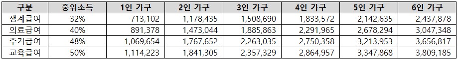 - 소득기준은 생계급여 32%, 의료급여 40%, 주거급여 48%, 교육급여 50% 세대구성 인원수에 따라 구분